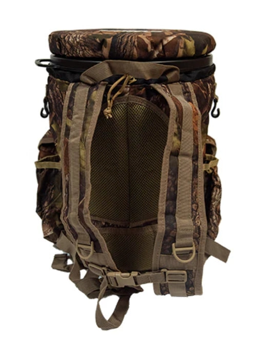 This camouflage bucket + backpack combination is a must have for every sportsman; perfect for hunting, fishing, camping, and everything outdoors. Comfortably carry a 5-gallon bucket (included) with strong and padded backpack straps and utilize the exterior pockets for accessible storage. The removable padded lid silently swivels and creates a seat wherever you need it.