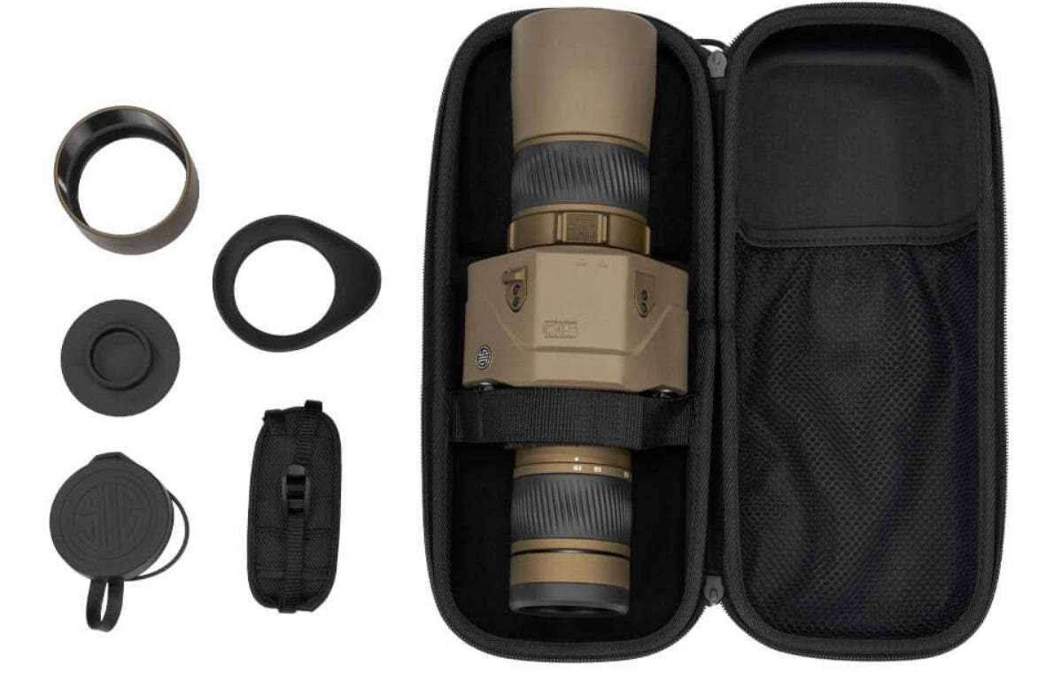 Includes Hand Strap, Molded EVA Foam Case, Removeable Sunshade, And Rubber Eyecup